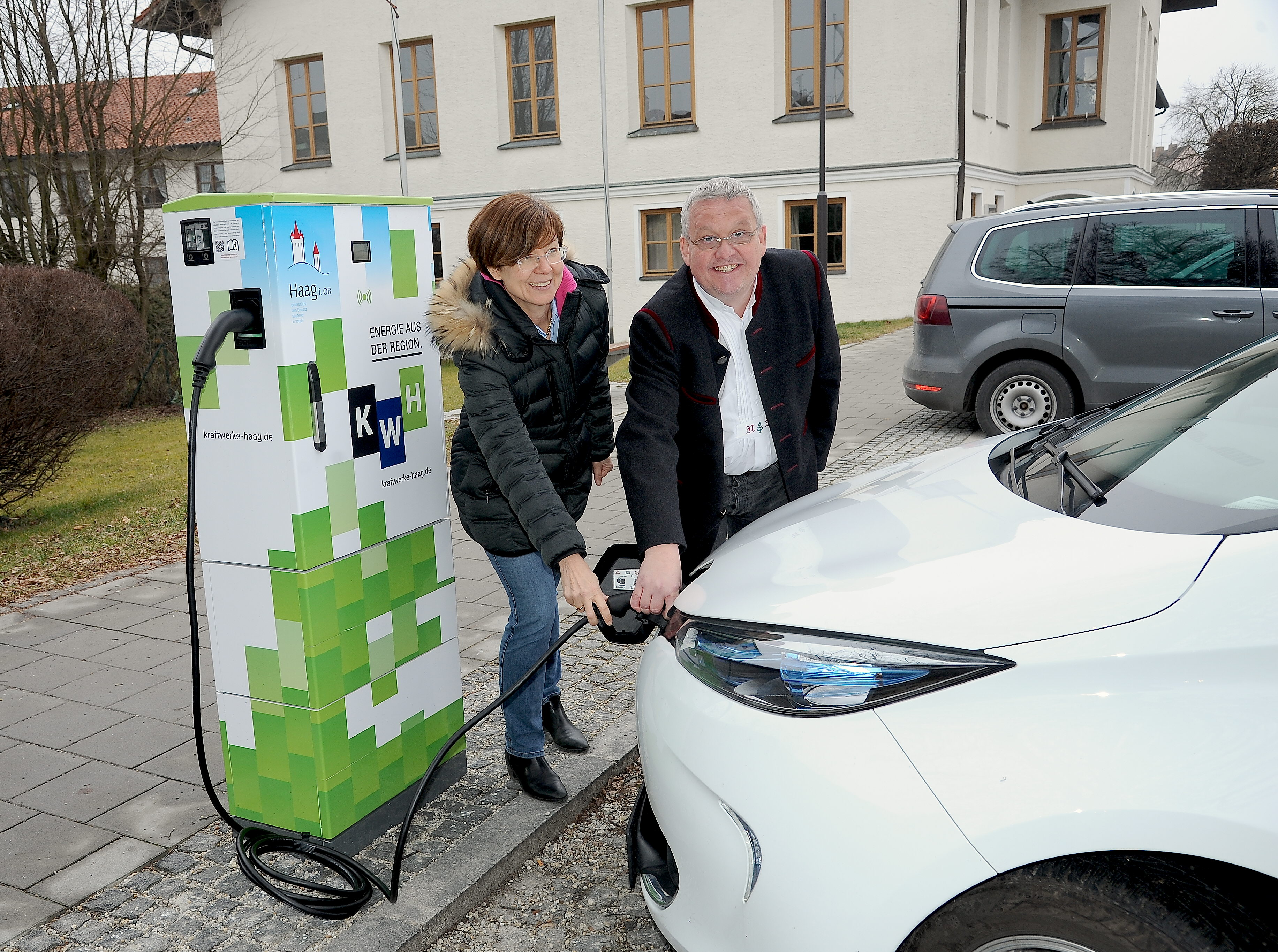 Gut sichtbar vor dem Bürgersaal ist die neue E-Ladesäule, ein Gemeinschaftsprojekt der Haager Kraftwerke und des Marktes Haag i. OB.. Bürgermeisterin Sissi Schätz und Dr. Ulrich Schwarz von den Kraftwerken Haag nahmen die Säule offiziell in Betrieb. Es handelt sich um eine geförderte Ladestation mit barrierefreiem Bezahlsystem. Der Markt Haag übernimmt den nicht geförderten Teil der Anschaffungskosten.