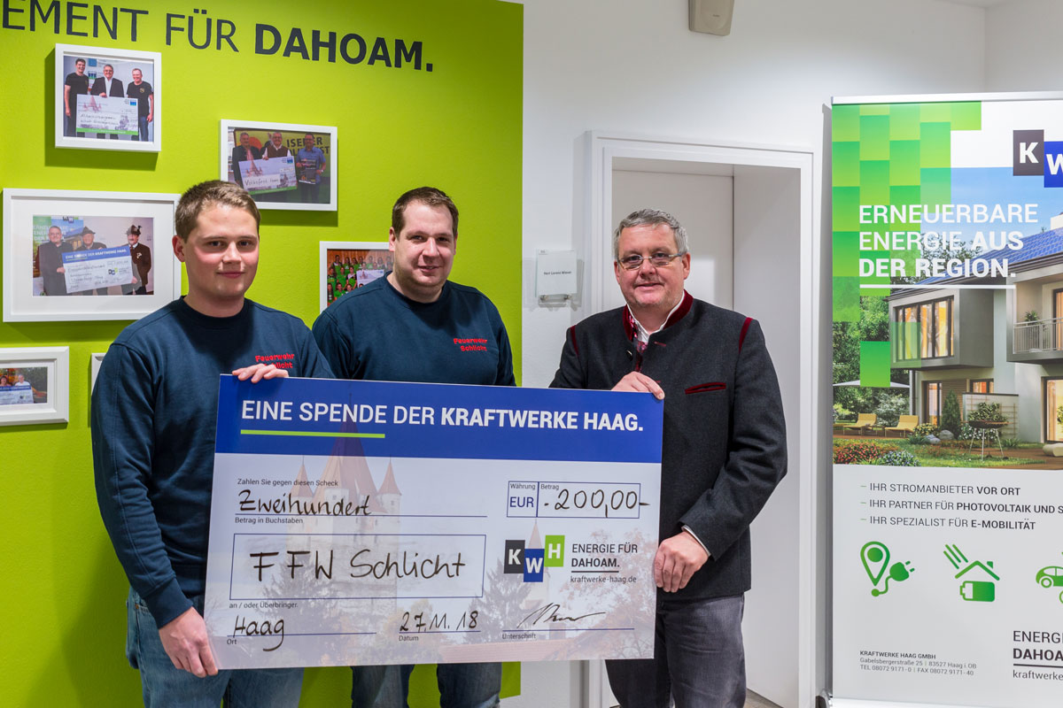Die Kraftwerke Haag spenden 200,- Euro an die Feuerwehr Schlicht um deren Jugendarbeit zu unterstützen. Bereits im Oktober führte die Feuerwehr Schlicht eine Rauchübung mit Personenbergung im Kraftwerk Soyen durch.